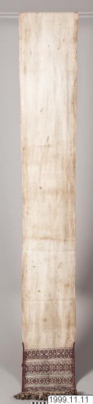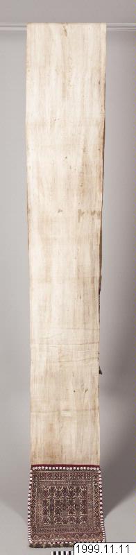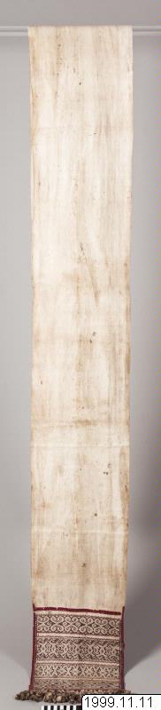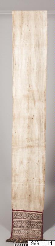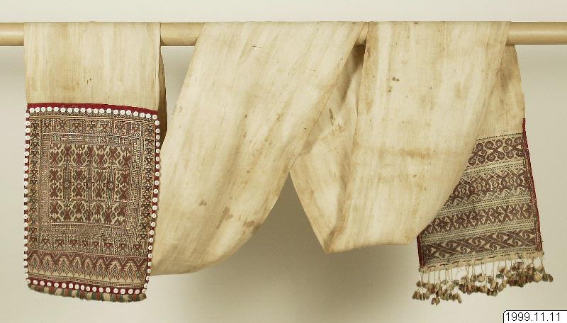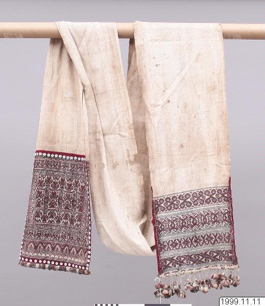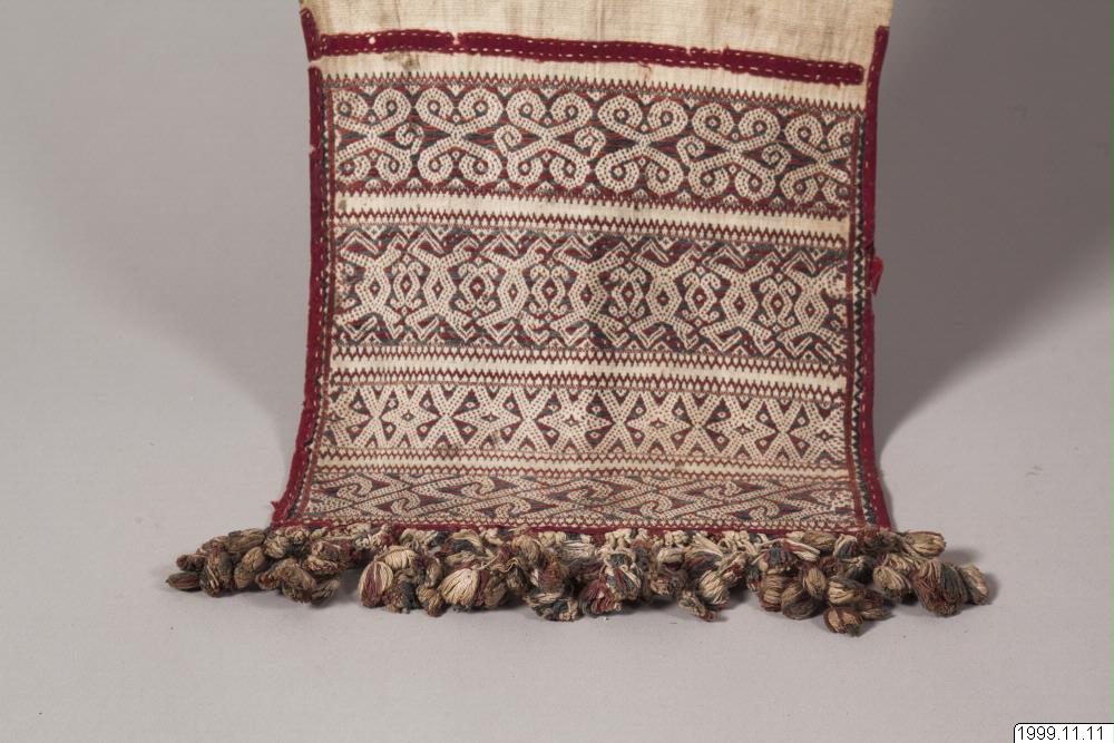 - Manligt ländkläde med ändpanelerna i supplementary weft, panel framtill dekorerad med snäckknappar och bakpanelen dekorerad med tofsar. Handspunnen bomull, växtfärgad.