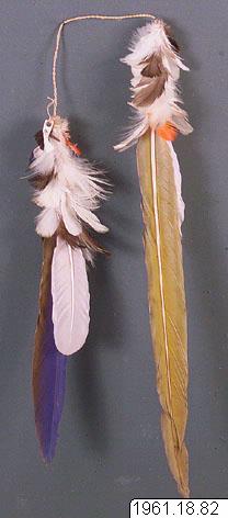 Öronprydnad. Snöre av växtfiber med två stora fjädertofsar, en i var ände, längd 37 cm resp 51 cm. Tofsarna består av en snöromlindad bit bamburör med fjädrar infästade under snöret, samt med större fjädrar i änden av röret. I änden på vart rör sitter en stjärtpenna från Blågul Ara och en vingpenna från Rosenskedstork. Längs med rören sitter mindre fjädrar runtom, vita från Ägretthäger eller Snowy Egret, svarta och grå från obestämd art, blå från Blågul Ara och röda från Ljusröd Ara.