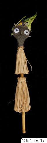 Människofigur, aruana-docka. Träpinne med två "kjolar" av bladremsor. Huvud av vax, med markerad näsa och ögon av pärlemorskivor och vax. Munnen är bara markerad som en liten skåra. Krona av fem vingpennor från någon Parakit och enstaka fjädrar vardera från Ljusröd Ara och Blågul Ara. Baksidan av huvudet klädd med diverse småfjädrar, från Blågul Ara, Rosenskedstork och någon obestämd papegoja.