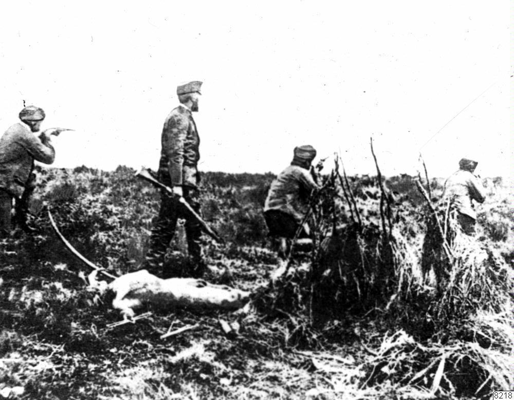 Motiv: En vit kolonist, Julio Popper, med sitt folk på indianjakt på Stora Eldslandsön. Popper var typen för en hänsynslös vit äventyrare, till börden rumän, uppfödd i Buenos Aires. Dog 5.6.1893. Utförde sina indianmord fr. 1886.