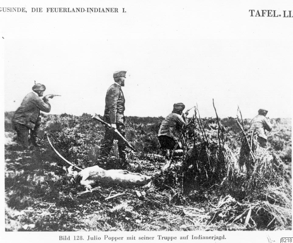 Motiv: En vit kolonist, Julio Popper, med sitt folk på indianjakt på Stora Eldslandsön. Popper var typen för en hänsynslös vit äventyrare, till börden rumän, uppfödd i Buenos Aires. Dog 5.6.1893. Utförde sina indianmord fr. 1886.