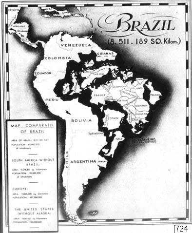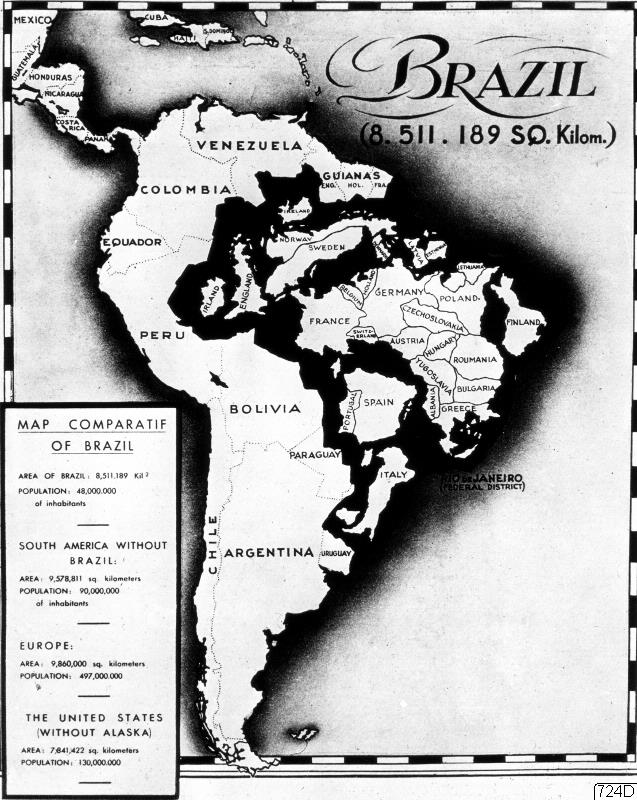 Brazil ", Rio de Janeiro, 1939. Kartan visar hur Europas länder ledigt rymmas inom enbart Brasiliens yta.