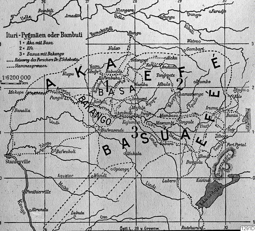 - Utbredningskarta. Paul Schebesta: Bambuti, die Zwerge vom Kongo. Leipzig 1932. P. 10.