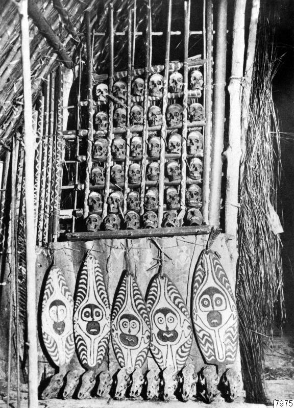 Trofésamling hos Gormier, hövding över ett dubu daima i Urama.