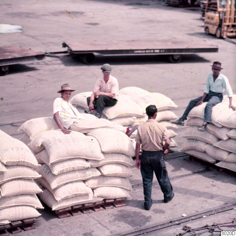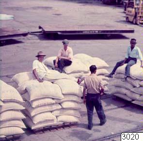 - Kaffelastning i Buenaventura, Columbia ca 10/1 1955. Siesta på säckarna.