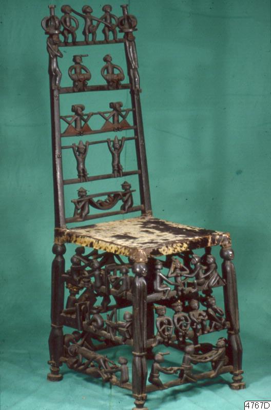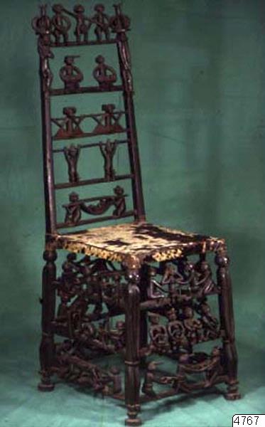 Belgiska Kongo och Portugisiska Angola 11 grader söder om ekvatorn. Stolen är tillverkad hövdingen till ära och skall utgöra en beskrivning på dennes liv allt från födseln. Angende åldern var det omöjligt att erhålla några uppgifter men den hade tillhört förre hövdingen och visste man sedan icke mera. Ännu finns i dessa trakter betydliga mängder etnografiska föremål att erhålla men infödingarna skiljas i högst ogärna vid dem, dock finns alltid möjligheter ifall sprit ingår i bytesvaran. Tjokwe är en mycket ogästvänlig och lömsk stam och tager ogärna emot någon vit man i sin by eller gör något för honom. Man märker väl skillnaden när man kommer från deras grannar Lundastammen som är synnerligen sympatisk och tillmötesgående. Tjokwestammen underkastade sig först 1917 de vita då Belgierna för att klara järnvägen till Katanga sände större vapenmakt. Förut hade en liten garnision uppehållits vid Dilolo Post men denna hade blivit inringad och räddades då. Stolen stod i hövdingens hydda när Clarence Lyon fick se den år 1929 i dec. när han var på väg från Katanga till Labito Bay