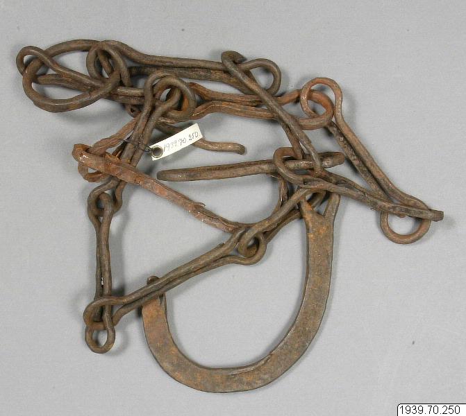 Grytkedjan (1939.70.0250) heter på nordsamiska ”rig’ge” (sydsam.:”rig’gi”). Den är en järnkedja med en krok som kokgrytan (”batte”) (1939.38.0001a-b) hängdes fast i kåtastången över eldstaden (”arran”) i kåtan. Grytkättingen skulle alltid behandlas varsamt, barnen blev utskällda om de vid packningen lekte med grytkättingen. (Elgström, 1922: 338) Samerna tillverkade aldrig metaller, utan köpte dessa dyrbara föremål från sina bofasta grannar.