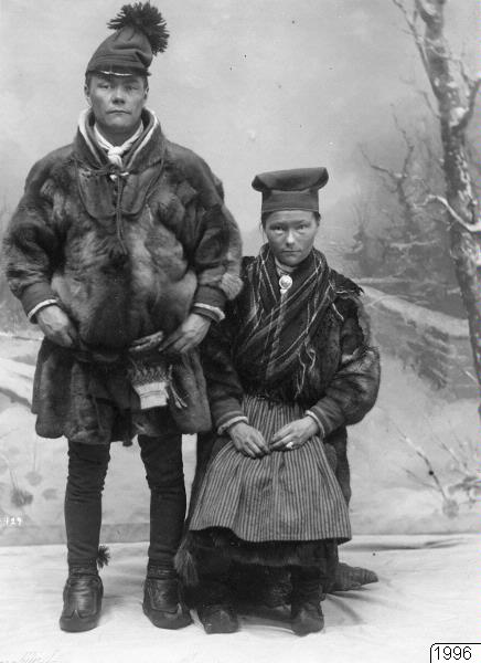 - Ateljébild av Jon Eriksson Pittsa från Norrkaitum, 32 år, och Katarina Paavasdotter Negga från Sörkaitum, 26 år, fotograferade på sin trolovningsdag 1910. Kiruna, Lule lappmark. Notera att de inte bär pälskläder på fötter och ben.