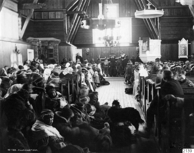Konfirmation i Karesuando kyrka. Nattvarden utdelas av dåvarande kyrkoherde Vitalis Karnell. Församlingen består nästan uteslutande av lappar.