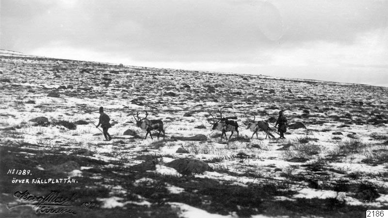 Släpning och klövjning med ren över fjällplatå sommartid.