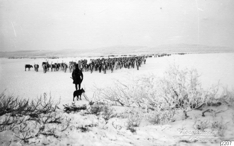 Renhjorden vallas på våren över sjöarna upp mot bättre beten bland fjällen.