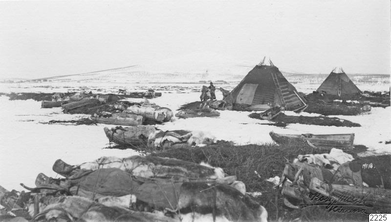 Lappläger med lastakjor. Observa formen på lastakjorna vitt skild från typen på en resakja med hög front och ryggstöd.