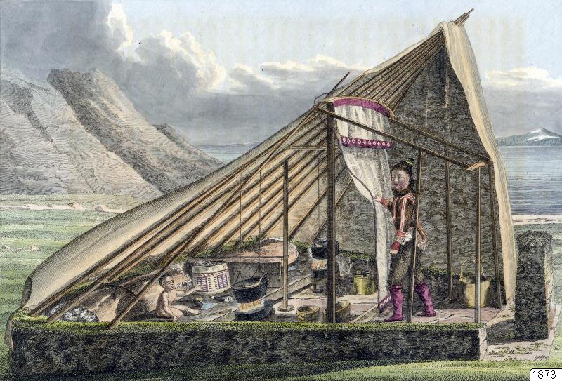 Motiv: Eskimåkvinna med barn i sommartält. Laverat tryck.