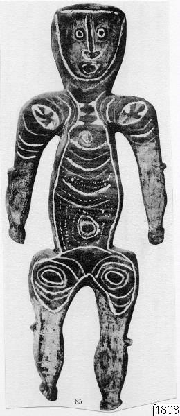 - Nya Guinea, Melanesien. Träfigur målad i röt och vitt. Höjd 107 cm. Uppgift i auktionskatalog. Fotot erhållit i fransk aukt. katalog. (Katalogkort)