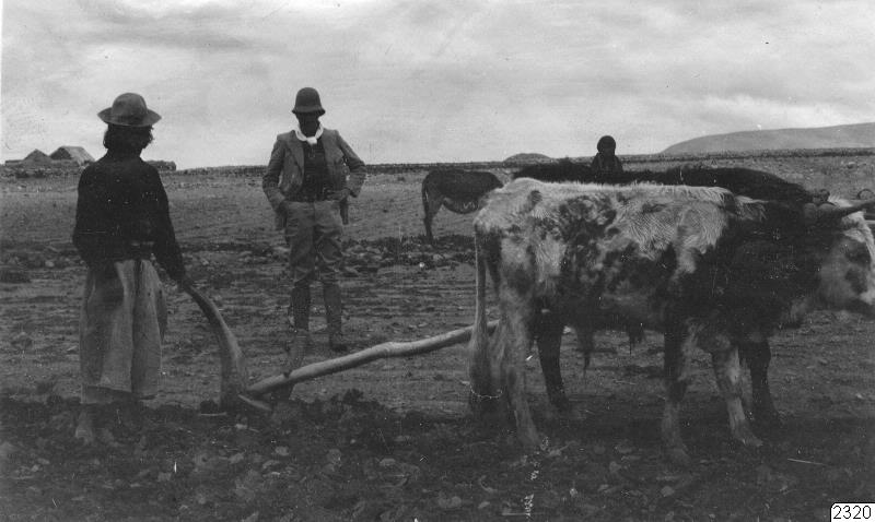 - Don Guidor Ayala betraktar plöjande Aymara-indian. Peruanska högslätten. Erhållen först efter restaurering negativ. (katalogkort)