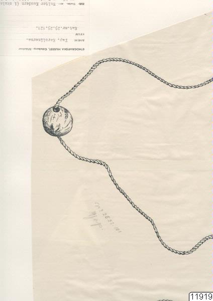 - Motiv: Pussel. Kat. nr 25.25.121. Lokal: Yap, Karolinerna. Teckn: Walter Kaudern (i skala 1:1) före 1929. Erh: gm köp av Kauderns bildmatrial 1947. Publ: W. Kaudern: Ethnogr. Studies in Celebes, IV, Gbg. 1925, fig. 81 A. (katalogkort)
