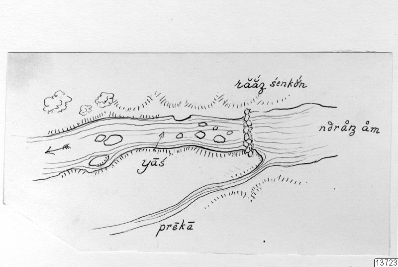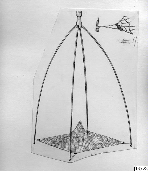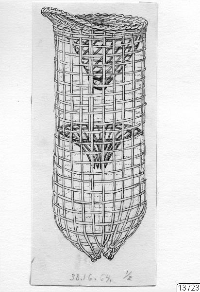 Motiv: Mjärde kat.nr. SEM 38.16.64 i saml. gjord av Izikowitz. Mjärdens l.=25 cm. Anordning för uppdämning av ström med stenar för placering av mjärden. Tredje teckningen en sänkhåv, även denna i Izikowitz' saml. i SEM, 38.16.?.