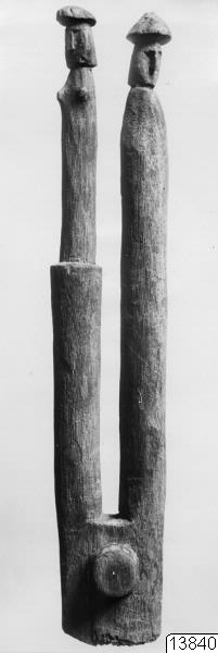 Motiv: Foto erhållet från Dr. Carl Schuster, Woodstock, N.Y., 1955 (hans neg. 1018.33) av dubbelfigur av trä, enligt uppgift från chocóijdianer. Föremålet tillhör Städt.Mus.f.Völkerkunde, Frankfurt a.M. (N.S. 24607), dit det köpts 1925 från en hr A.Speyer, Berlin. Höjd 38 cm.