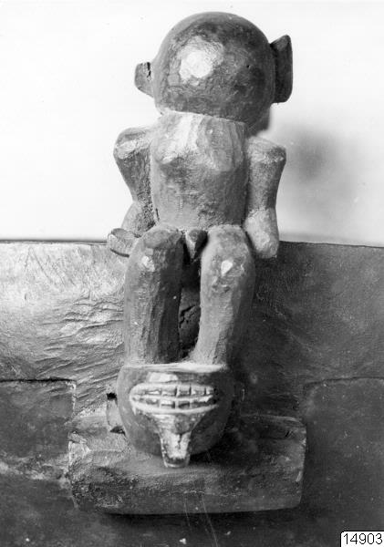 Skål av lätt trä. Svartfärgad. Skålens längd (figurerna inte räknade) 27,5 cm. Vid vardera sidan, där greparna brukar vara placerade, små snidade figurer vilka sitter hukade på skålens kant. Huvudena vända åt samma håll. Den ena figurens ben placerade på ett upp och >
