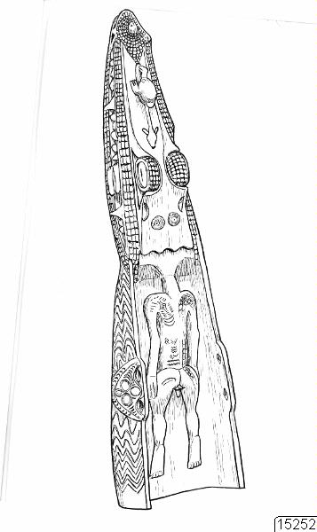 Avsågat kanotstäv. Har längst fram formen av ett krokodilhuvud. Den avsågade stävens längd: 180 cm. Stäven är skuren i ett stycke som varit detsamma som den urholkade kanoten. De båda sidostyckena är prydda med inskärningar i ett sicksackmönster. vänd)