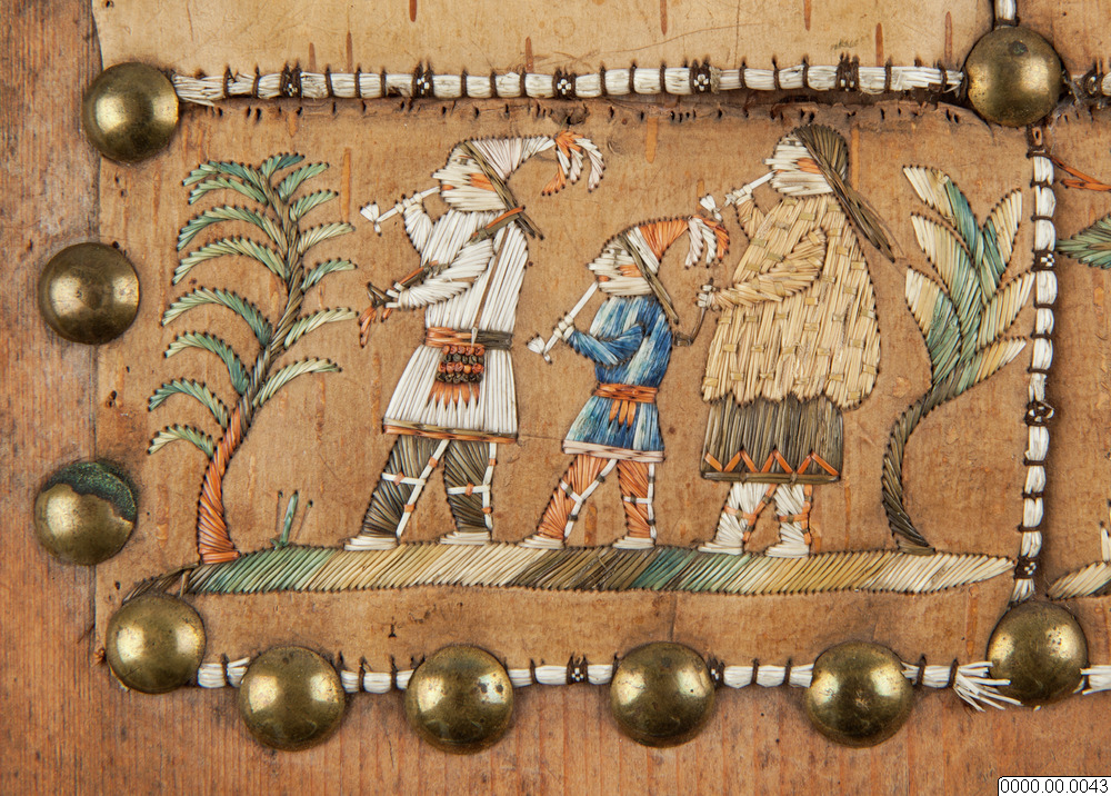 Broderi på nävfer, föreställande infödingdräkter från Canada.
