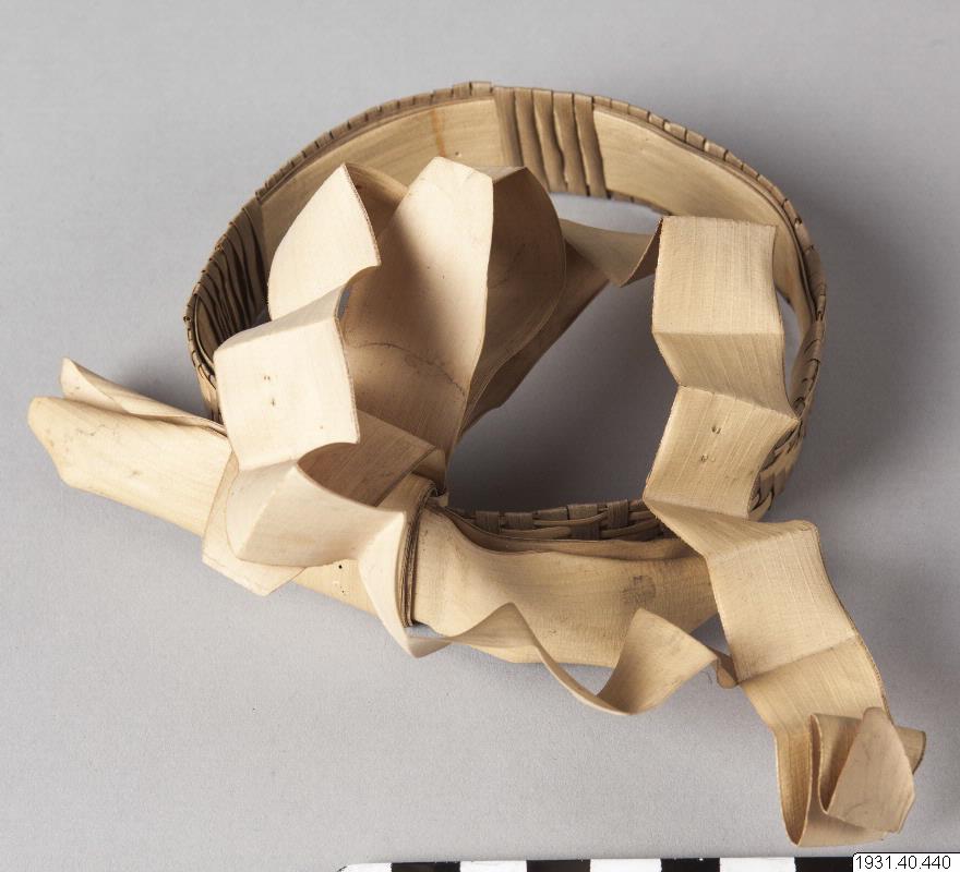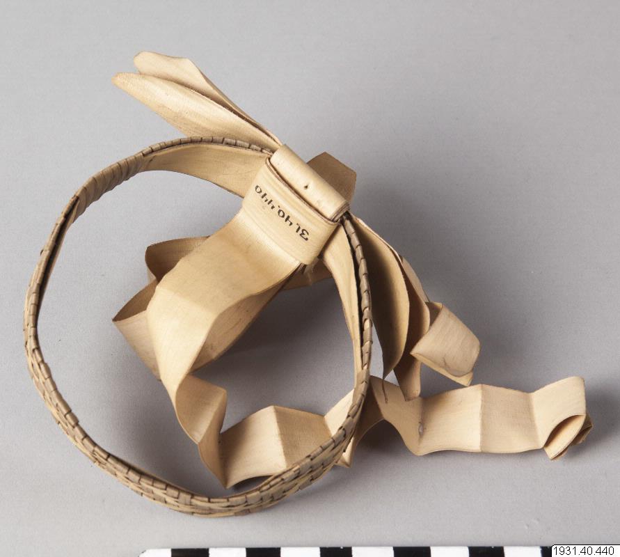 - Flätat överarmband med "vingar". Användes vid Pico-kamcwú-ceremionien (se anm. 9 i orig. kat.). (katalogkort/originalbeskrivning)