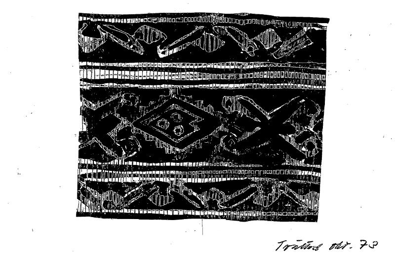 Mönster Zoomorf. Motivet består av en stiliserad tvåhövdad fågel. De två kropparna bildar en romb med ett stiliserat djuransikte (?) På båda sidor om huvudmotivet finns ett motiv med en tvåhövdad fågel vänd upp och ner förenad genom fåglarnas näbb.