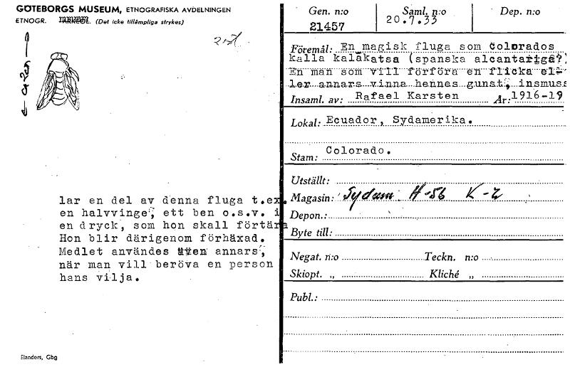 En magiska fluga som colorados kalla kalákatsa (spanska alcantariga ?). En an som vill förföra en flicka eller annars vinna hennes gunst, insmusslar en del av denna fluga t.ex. en halvvinge, ett ben o.s.v. i en dryck som hon skall förtära. Hon blir därigenom förhäxad. >.
