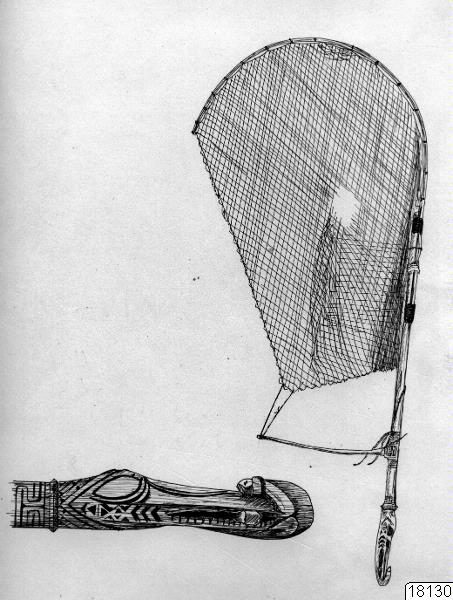 Nät med träskaft, för infångande av flygfisk. Skaftet är dekorerat med ett krokodilhuvud vars nos omslutes av en liten opossum. (Se brev från H.M. Lissauer till GEM 30.7.1970. föremålsnr. 12435.)