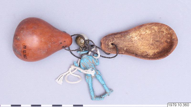 Skramla, leksak, av kalebasskal, plastfigur och pärla.