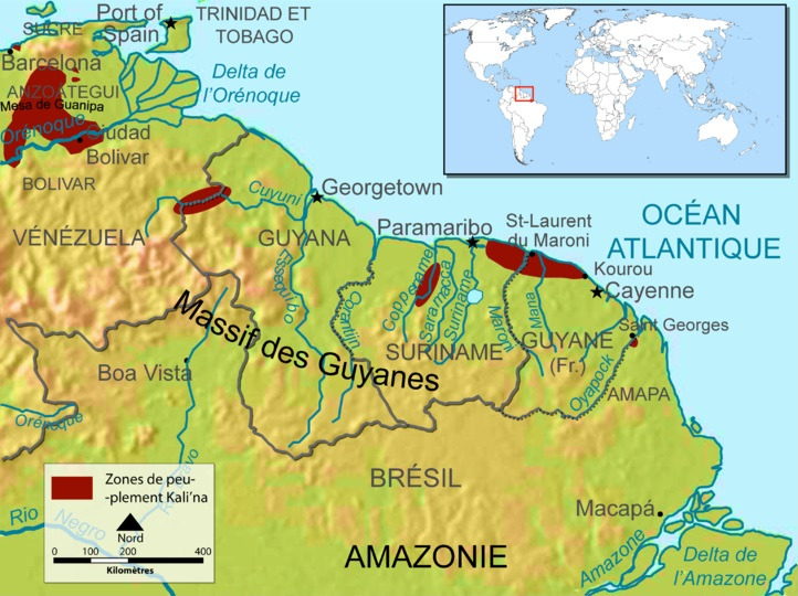 The part of South America where the Kali'na live today is sparsely populated. Their current geographic distribution covers only a small fraction of their Pre-Columbian territory.