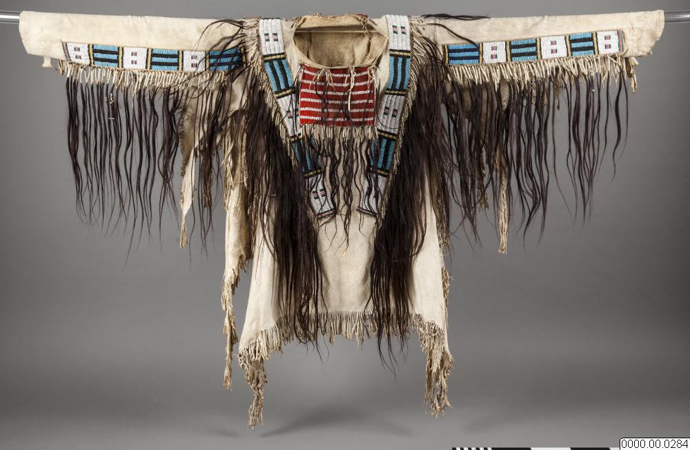 En magnifik krigsskjorta från sioux, teton lakota, senare delen av 1800-talet. Namnet sioux är förfranskat ojibwaspråk och betyder huggorm. Själva kallade sig siouxerna för dakota, bundsförvanter. Språket existerar i tre dialekter dakota, nakota och lakota, den sistnämnda den västligaste. Lakotas utgjorde under 17- och 1800-talen betydande maktfaktor på de norra prärierna, och trängde i kraft av sin numerär undan befolkningsmässigt mindre stammar. De framtvingade, med början kring 1850, stora militära insatser från den amerikanska regeringen. Dessa stridigheter kulminerade under 1860- och 70-talen i Red Clouds respektive Sitting Bulls krig och skjortan är enligt katalogkortet från tiden kring det förstnämnda. Den kom till Göteborg redan 1873