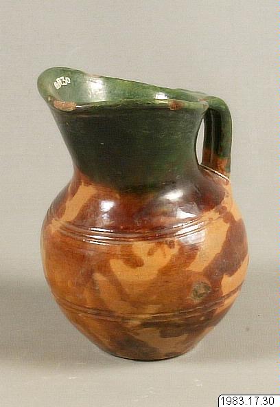 Kommentar: kärlet har ett öra som går från öppningen till halva tillbringaren. Föremålet är glasserat. Bitar av färg har försvunnit främst vid öppningnen på tillbringaren.
