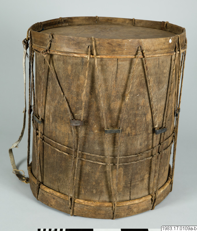 Kommentar: i trummans över- och underkant sitter fästat ett nött vitt läderbälte att bära trumman i. Trummans kropp har sprickor på flera ställen varav två ganska stora. Mitt över trummans kropp löper ett dubbelt läderband.