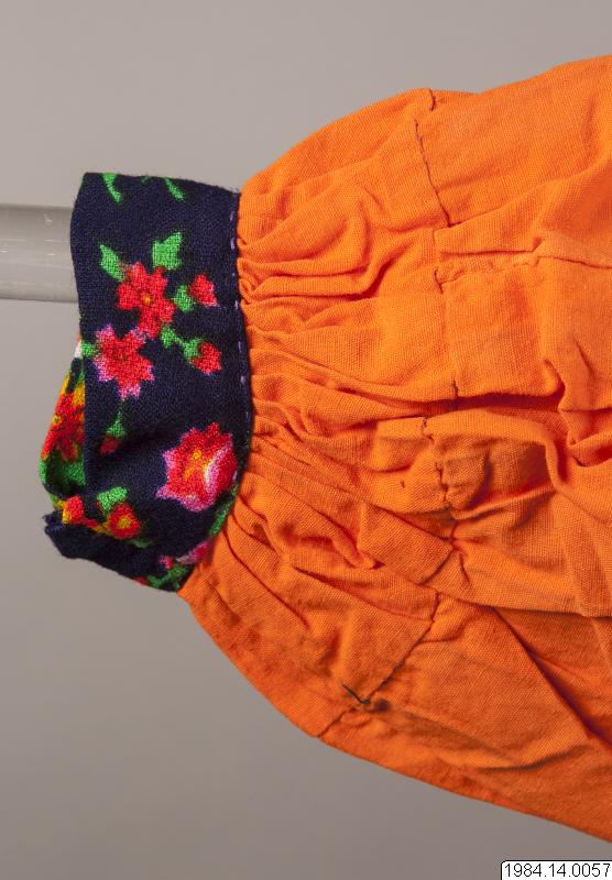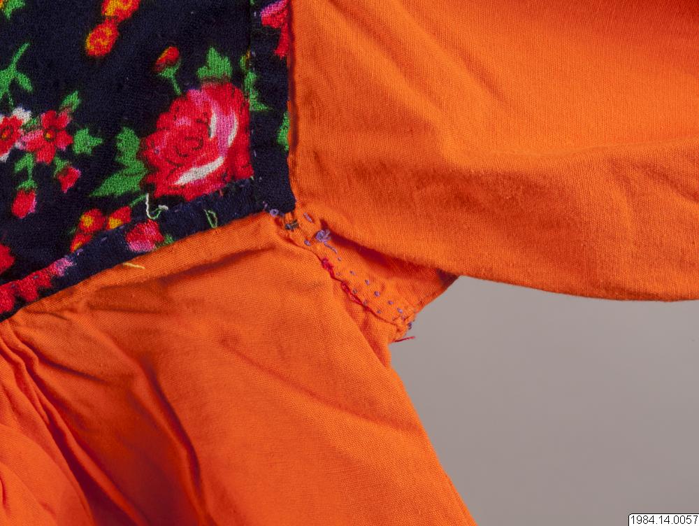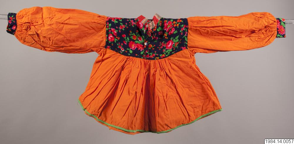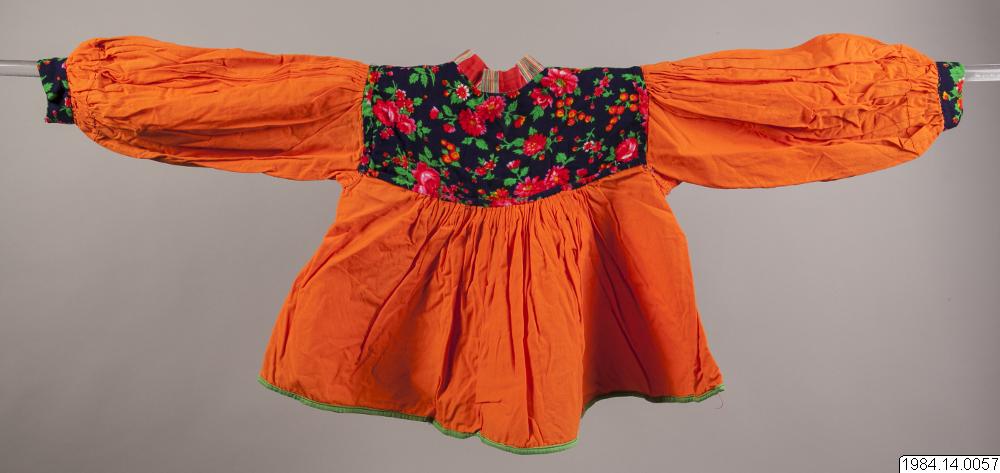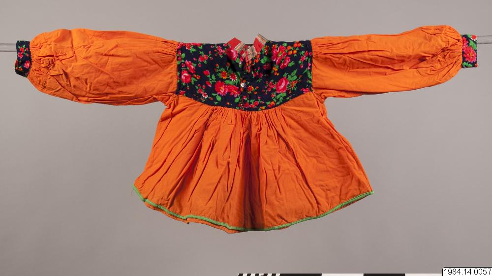 Blus för barn av orange bomullsväv med axelok och manchetter av mörkblått tyg med stora blommor i rött, gult och grönt. Halsen är rundskuren med en liten upprättstående krage av rött bomullstyg med grupper av olika breda ränder i grönt, blått, gult och vitt. I