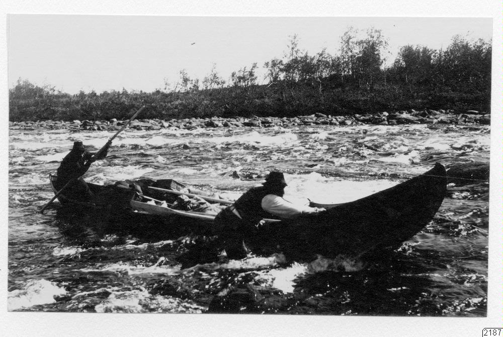 - Transport uppför Rautasjokk. Båten har lättats genom att en av männen gått ur och vadar.