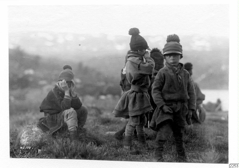 - Talma-pojkar från lapplägret. Breda bälten av läder till de korta koltarna. Alla har skärmmössor med röda yviga tofsar utvisande deras kön.