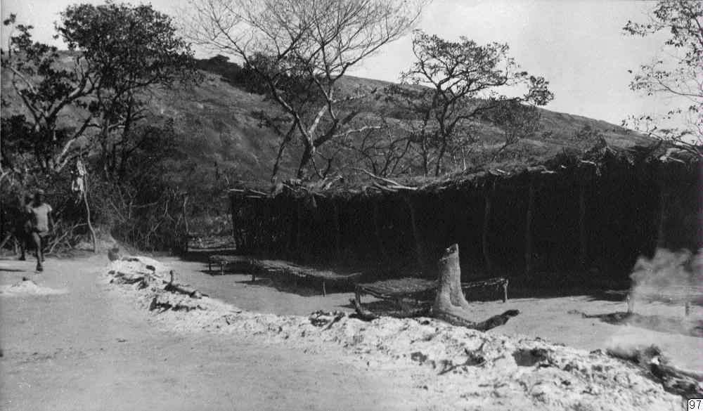- Från initieringscermoni. De nyinviterades hydda med den ständigt brinnande elden. Bredvid eldstaden står en man. Bakom mannen hänger ett dött djur från en stolpe.