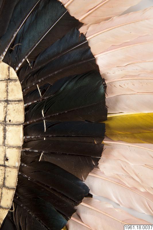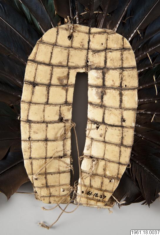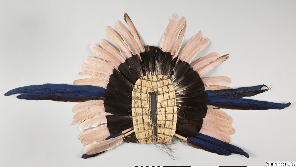 Huvudprydnad för män, gjord av män. En fjäderprydnad med från dubbelplåtar av "skalet" från ett djur med fyrkantiga benplåtar radiärt utstrålande fjädrar av bl.a. ararapapegoja. Fjädrarna sitta nedstuckna i rörhylsor. Innerst på båda sidor en krans av svartblå fjädrar. >