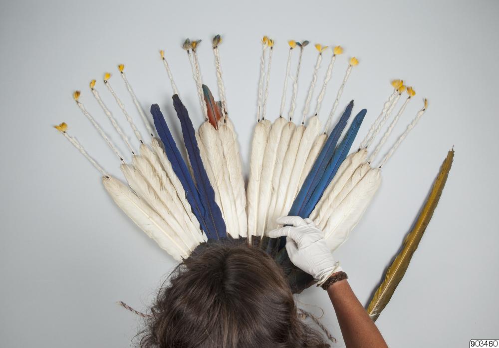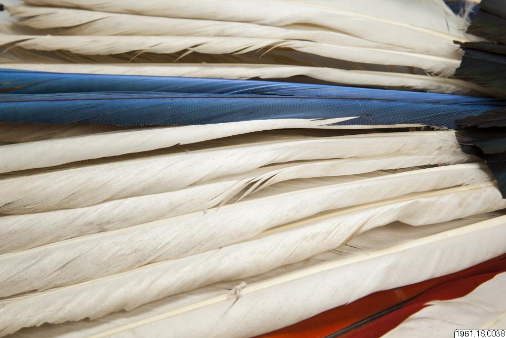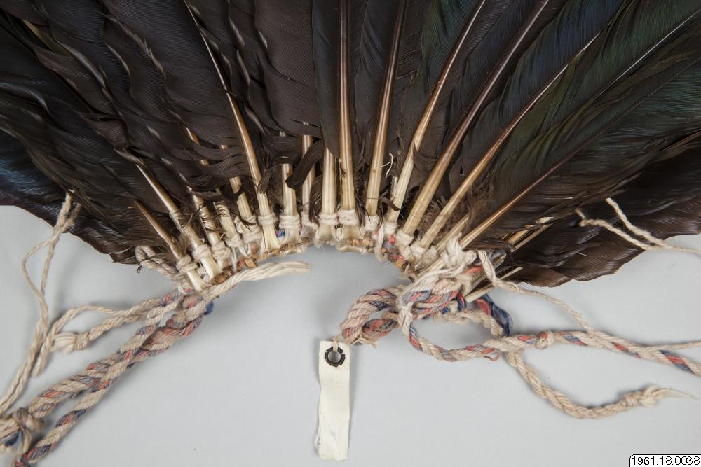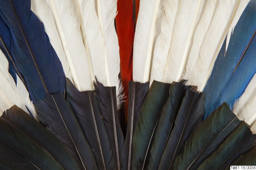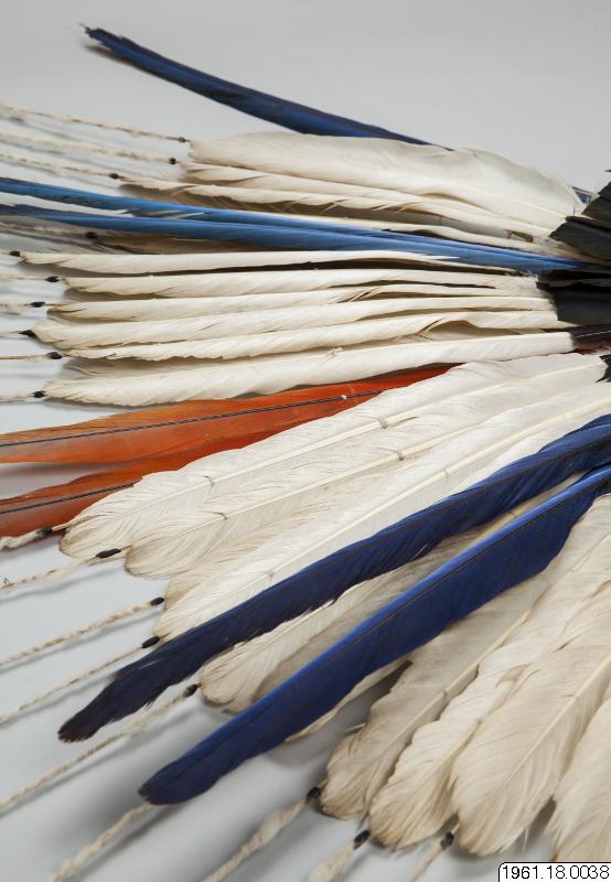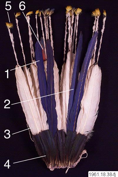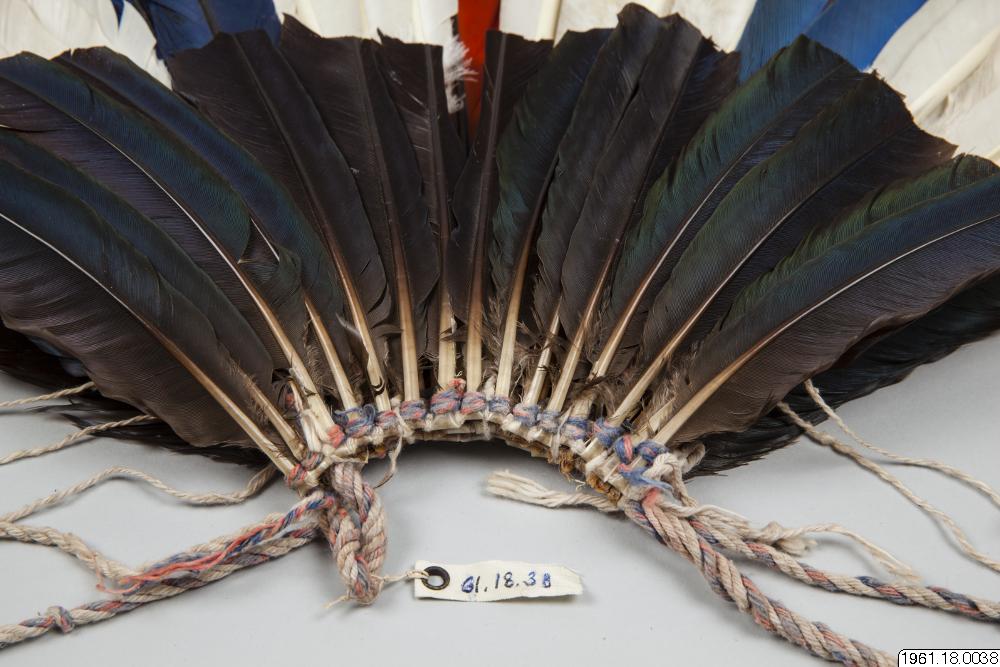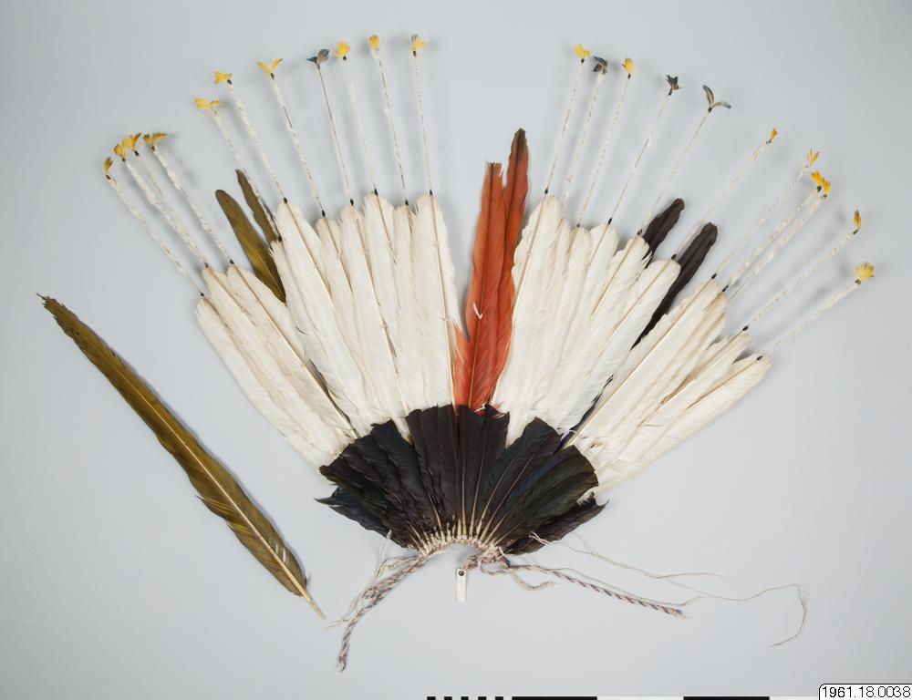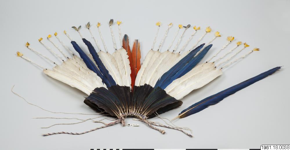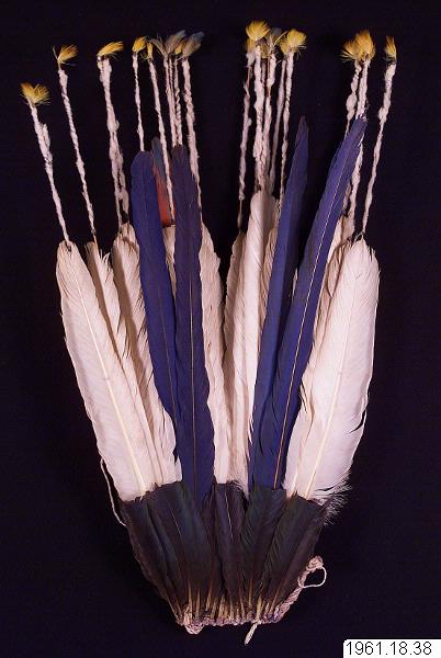 En 62 cm hög fjäderprydnad för huvudet. Gjord av män, användes av männen. Vita och mångfärgade fjädrar, de senare blå och gula från papegoja. Fjädrarna är fästa vid en bindning av bomullssnöre. Flertalet fjädrar har fastbundits vid tunna pinnar som sticker högre upp, >