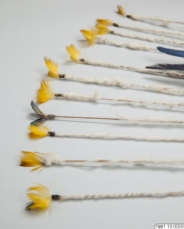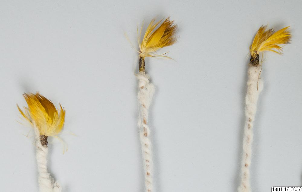> som är klädda med vitt fibermaterial (bomull?) och avslutas upptill med småfjädrar. Samlarens orig.nr. 37: "Head dress, feathers". (katalogkort/originalbeskrivning)