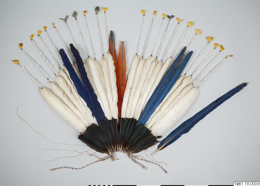 En 62 cm hög fjäderprydnad för huvudet. Gjord av män, användes av männen. Vita och mångfärgade fjädrar, de senare blå och gula från papegoja. Fjädrarna är fästa vid en bindning av bomullssnöre. Flertalet fjädrar har fastbundits vid tunna pinnar som sticker högre upp, >