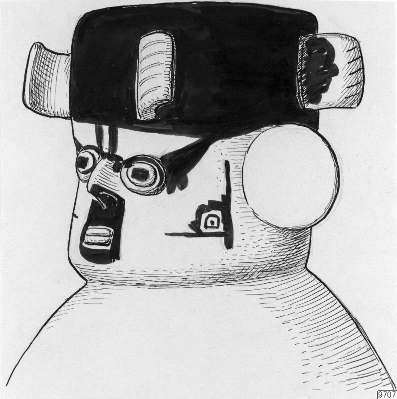 Kärlet har målad dekor i svart som är gjord med "snabba", stora penseldrag. Färgen har på vissa ställen runnit. Halsens baksida och den övre tredjedelen på halsens framsida är i princip helt svartmålade. Snett nedanför ögonen i det avbildade ansiktet är det målat ett litet mönster, och detaljerna i ansiktet (ögon, näsa, mun) är markerade med svart färg. Stora delar av bukens baksida är målad med stora svarta fält, och på bukens framsida är kärlets utbuktningar svartmålade, samt två