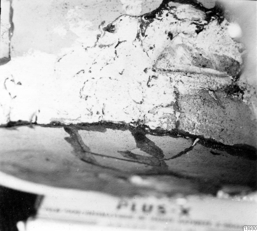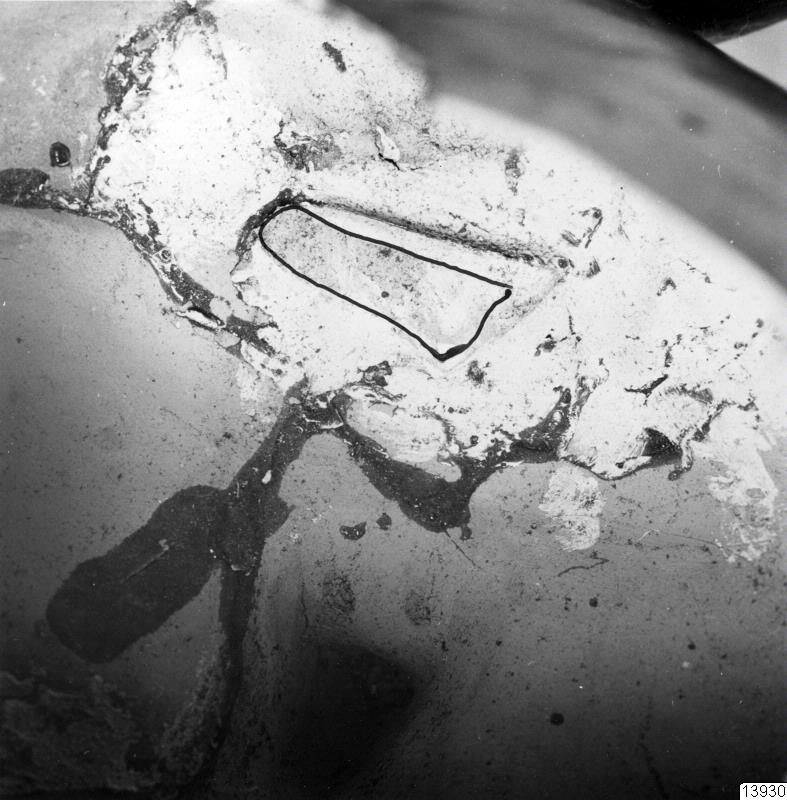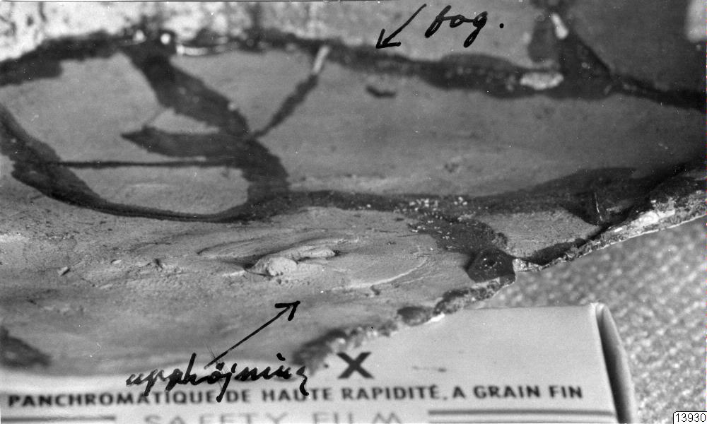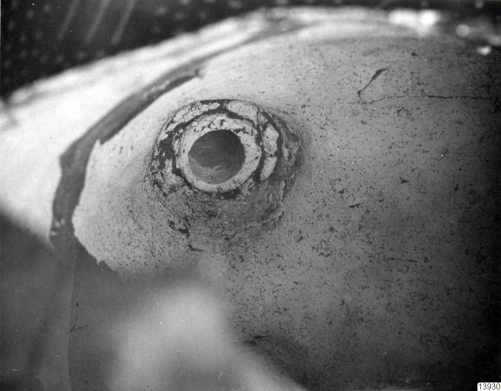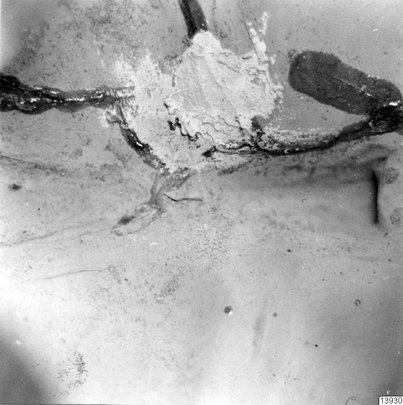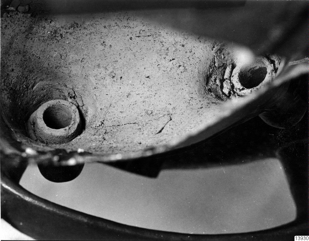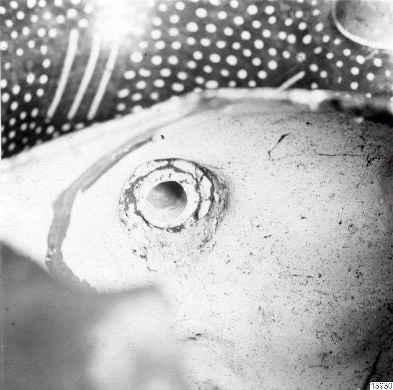 Motiv: 7 fotos. Detaljer av huvudkärlet 35.32.178 (för förfalskning undersökt): pipöppningarna i det inre, innerdeln av botten med upphöjning och fog runt botten mot vertikalväggen; förstärkning bakom tänderna med särskild där fastsatt krukskärva (restaureringsarbete i Lima).