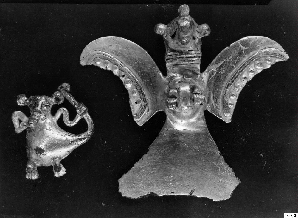 Motiv: "Guldörn" (= tumbaga-figur), största vingbredd 10,7cm, kat.nr. 1955.39.0002, samt Apa som håller sig i sin svans (typiskt motiv), även så av tumbaga, kat.nr. 1955.39.0008. Arkeologi.