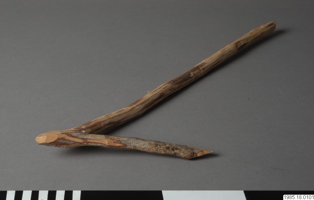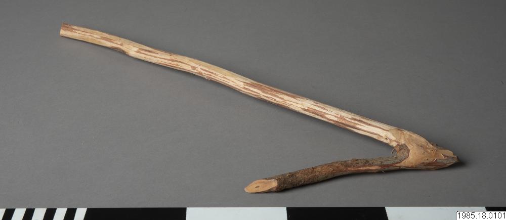 Gräsrepare, sp: gancho, MN: qajwujw. Troligen tillverkad av duraznillo. denna gräsrepare användes för att repa av gräs för taktäckning. Jfr 1985.18.0054. 0063 & 0064.