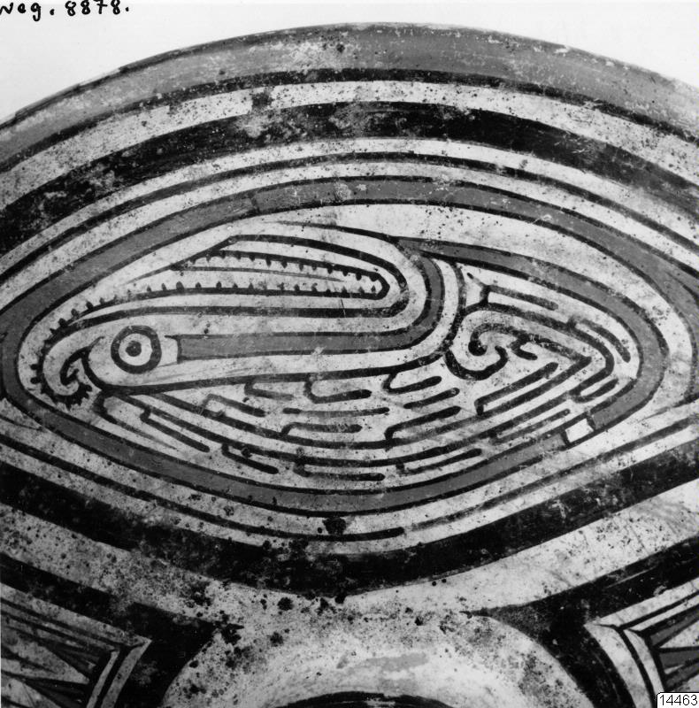 Motiv: Två fotos (undersida och detaljbild) av polikroma lerkärlet 58.31.2. Jämför bildnr. 14451 med ren profilbild av samma kärl (neg. 8845).
