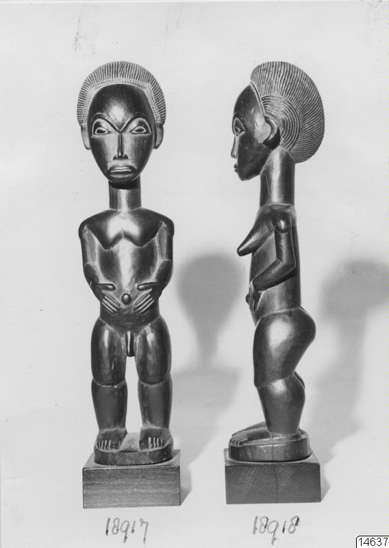 Motiv: En manlig och en kvinnlig trästayett. Höjd: 30 cm. Salubjudna för 450 per styck 1960. Från M.L.J. Lemaire, Amsterdam.