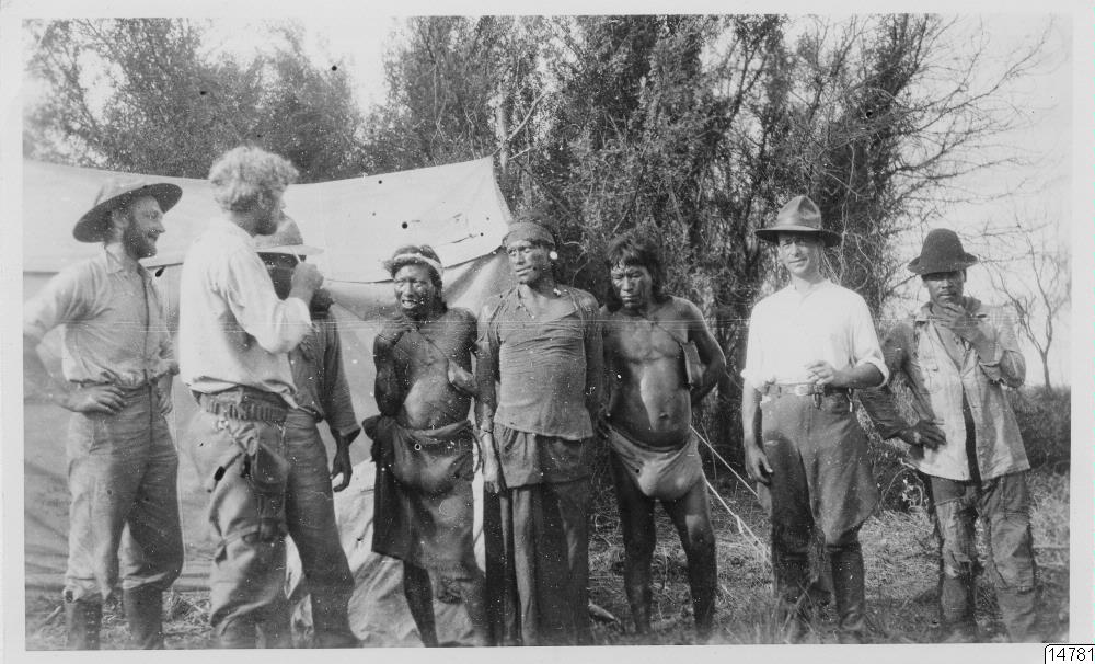 Motiv: Foto från Emil Haegers expedition 1920 visande bl. a. till vänster Don Mauricio Jepserson ( i vit skjorta) och G. Emil Haeger i cowboyhatt. Jämför bildnris 14779 och följande. Jämför etnografiska samlingen 62.4. Lokal: Argentinska Chaco.