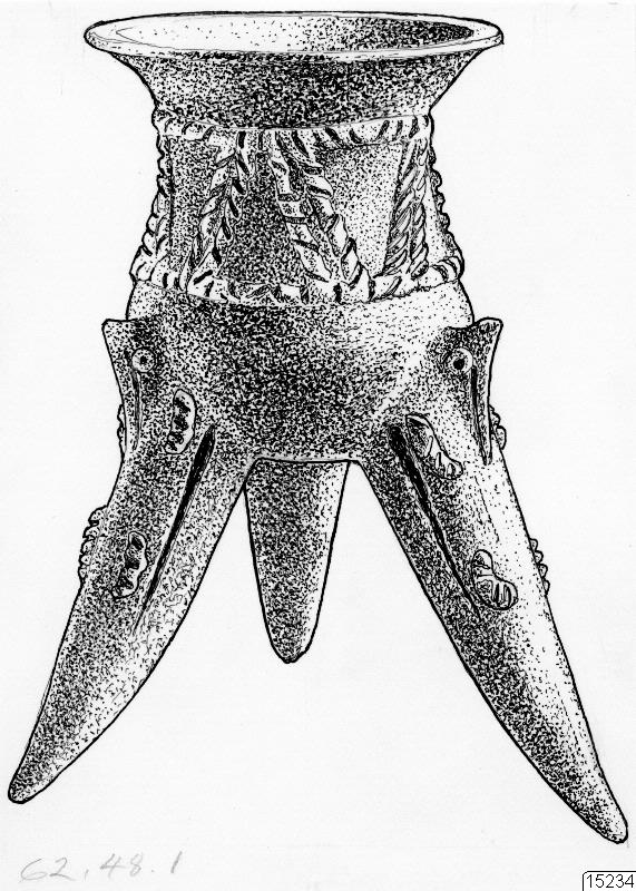 Motiv: 23 cm hög tripod med skallerkulor i benen som är i form av stiliserde fiskar. Kat.nr. 1962.48.0001.